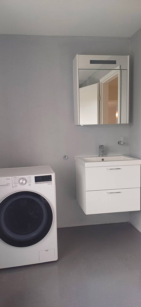 Waschmaschine/Trocknereinheit im Badezimmer. Mit dem Balkon eine sehr gemütliche Wohnung.