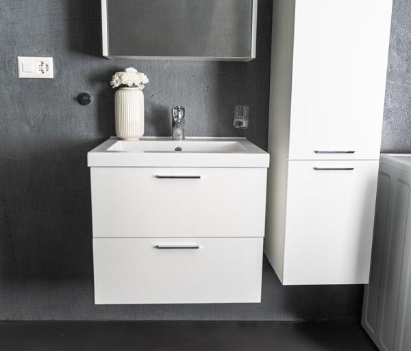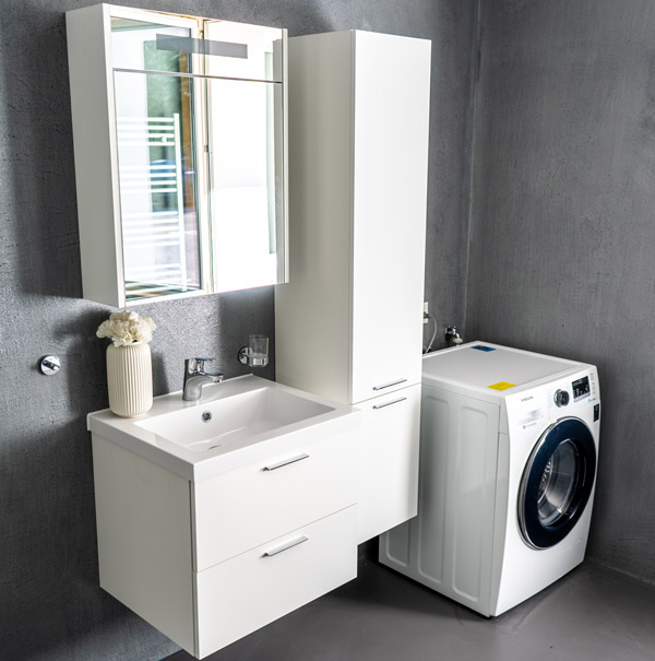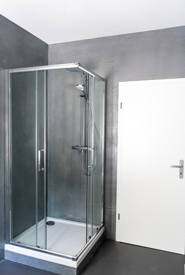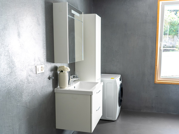 Im Badezimmer hat es eine Dusche und eine Waschmaschinen/Trocknereinheit.
