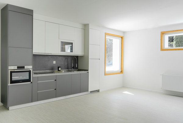 Diese moderne Wohnung hat eine geräumige Küche mit einem Glaskeramikherd und einem Backofen mit Steamfunktion.